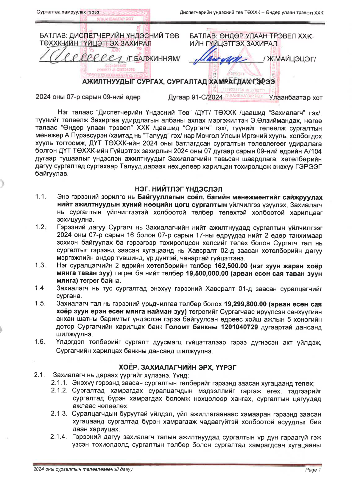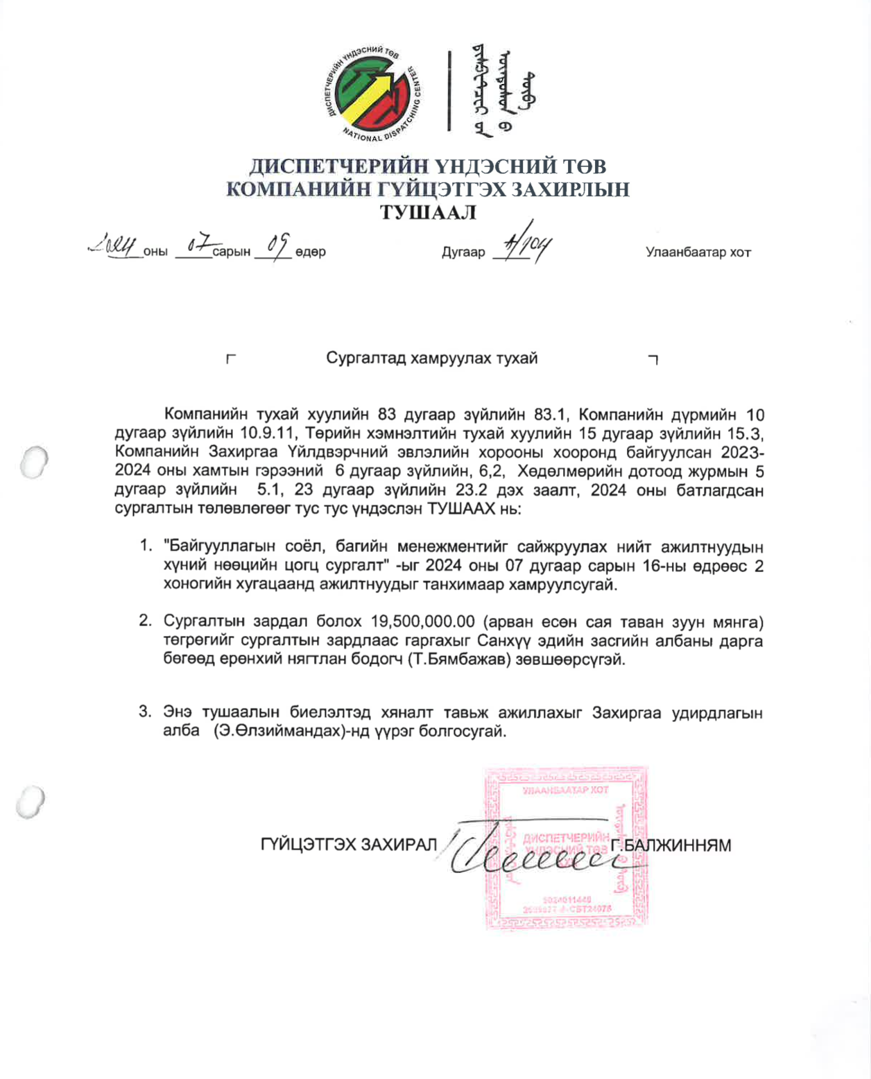 Тухайлбал, Г.Балжинням захиралтай Диспетчерийн Үндэсний Төв ТӨХК нь 2024 оны 7 дугаар сарын 9-нд буюу наадмын өмнөх өдөр тансаг зэрэглэлийн “Редрок” амралтын газрыг ажиллуулдаг “Өндөр улаан трэвел” ХХК-тай 19,500,000 төгрөгийн үнийн дүн бүхий гэрээ байгуулж, “Ажилтнуудыг сургах, сургалтад хамруулах” гэх зорилготой энэ сургалтад 120 ажилтан нь хамрагджээ.
