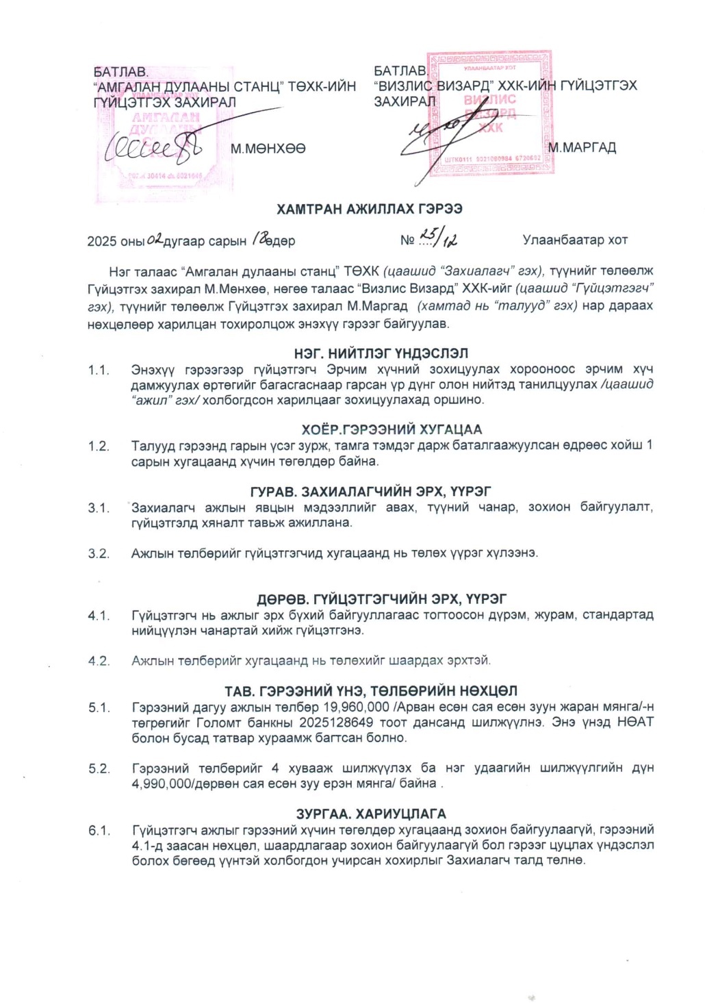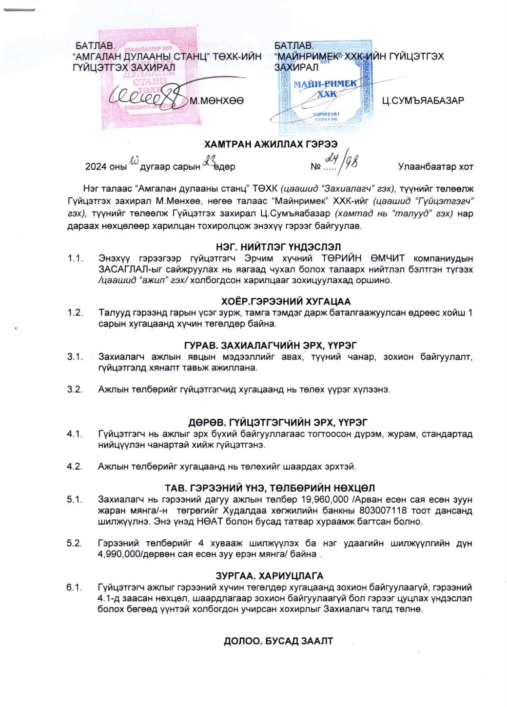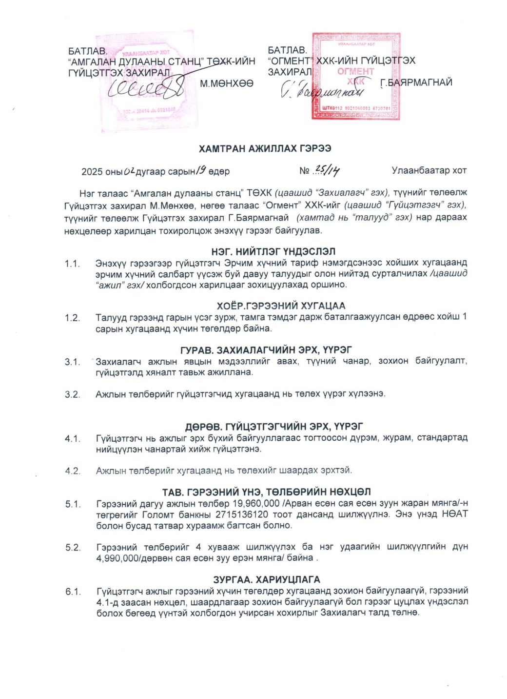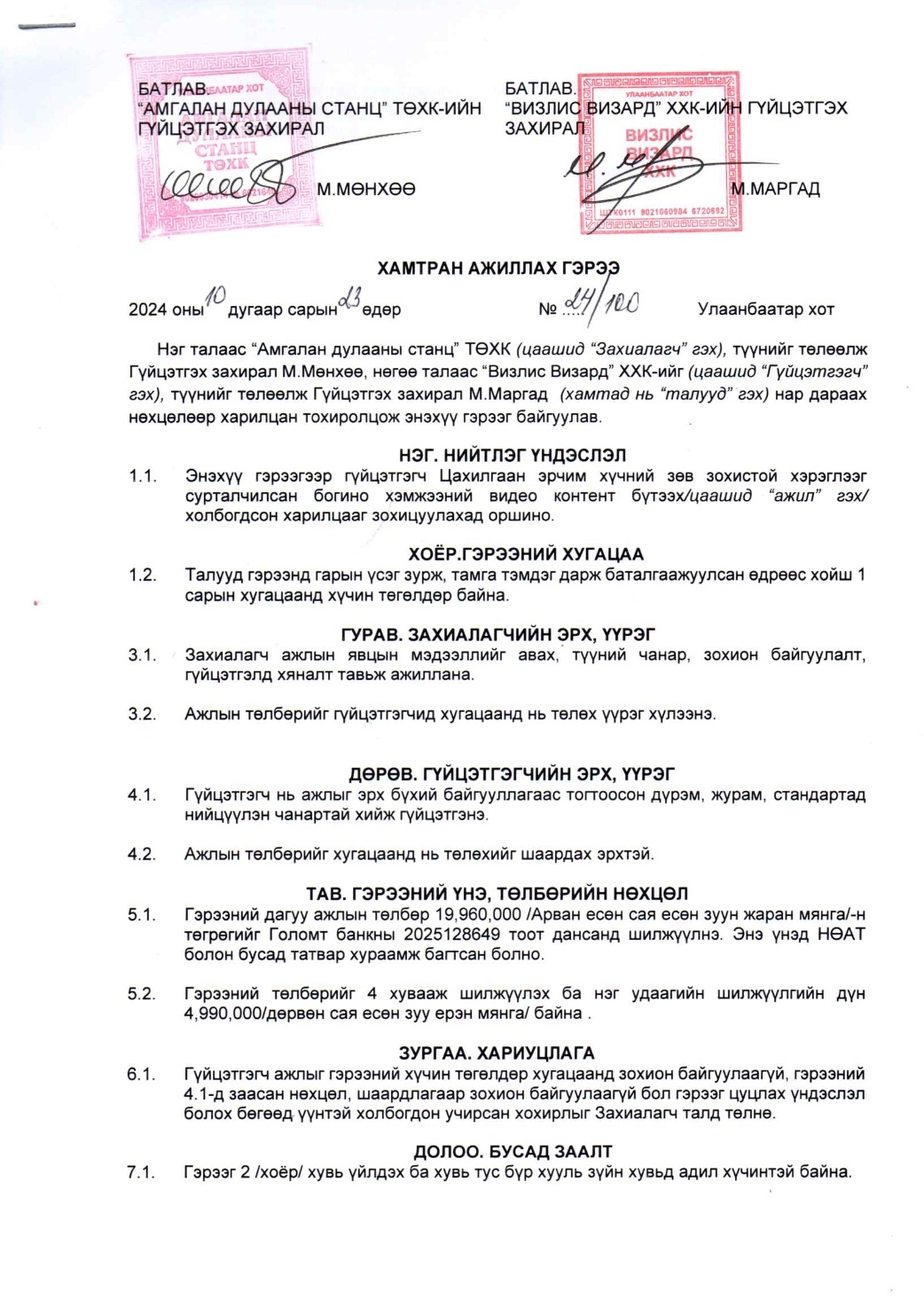 Тус компанийн захирал М.Мөнхөө гэгч нь 2024 оны 10-р сарын 23 болон 2025 оны 2-р сарын 20-ны өдөр Майн Римек ХХК, Блейк стар альфа ХХК, Визлис визард ХХК, Энхансмент ХХК, Огмент ХХК зэрэг компаниудтай нийт 8 удаагийн гэрээ байгуулж нийт 159.6 сая төгрөгийг төсвөөс санхүүжүүлэн шилжүүлжээ.