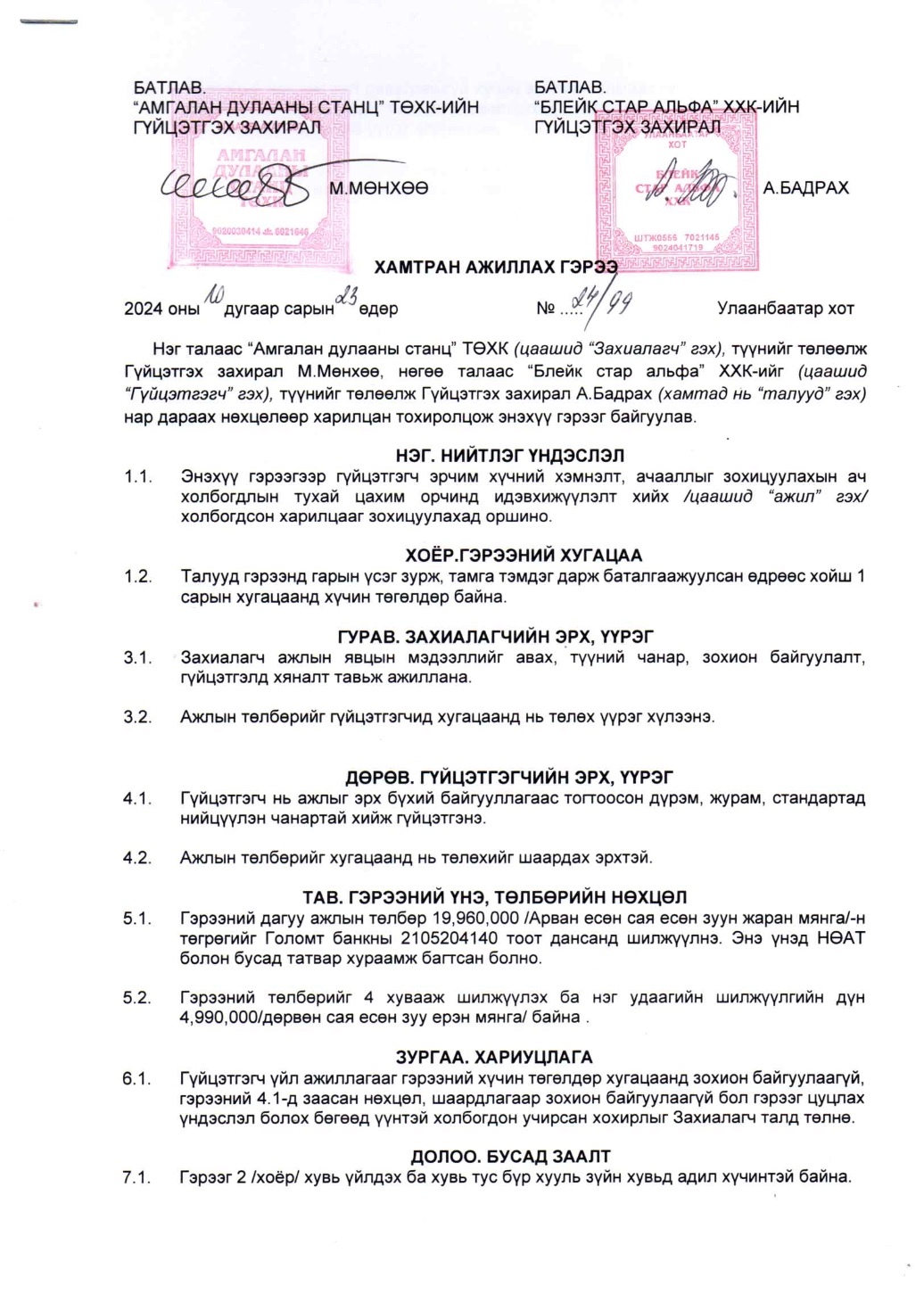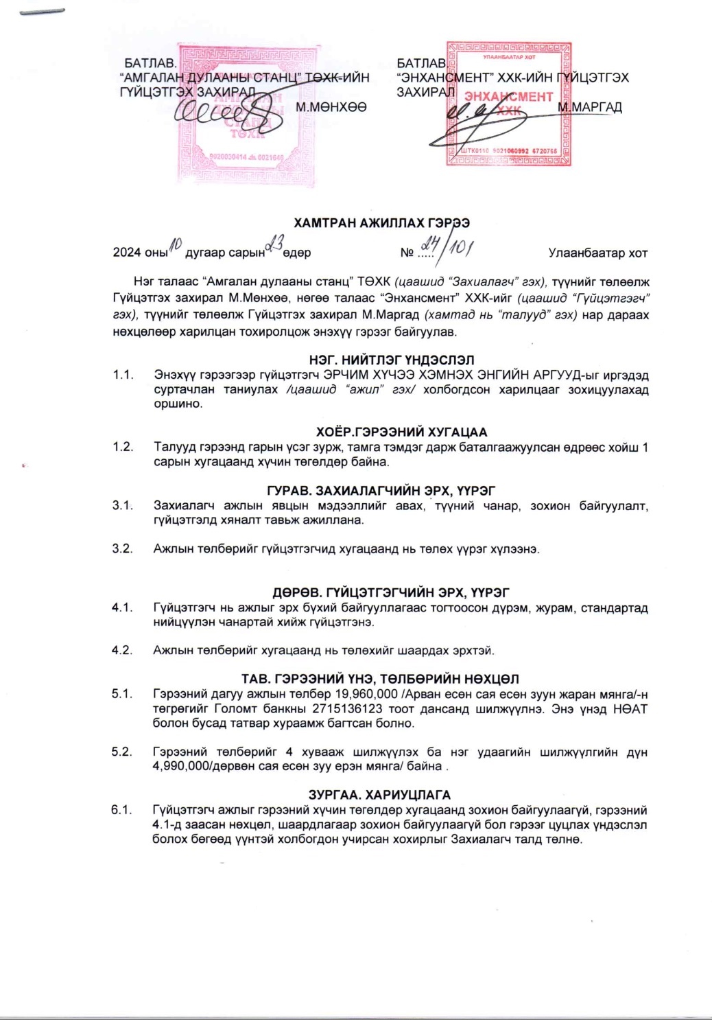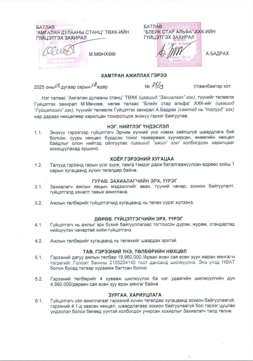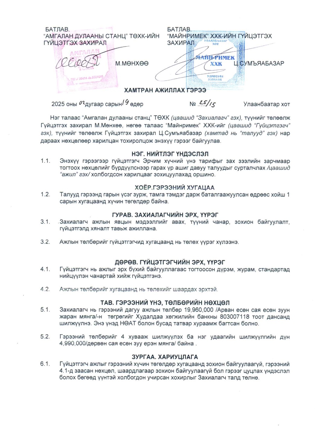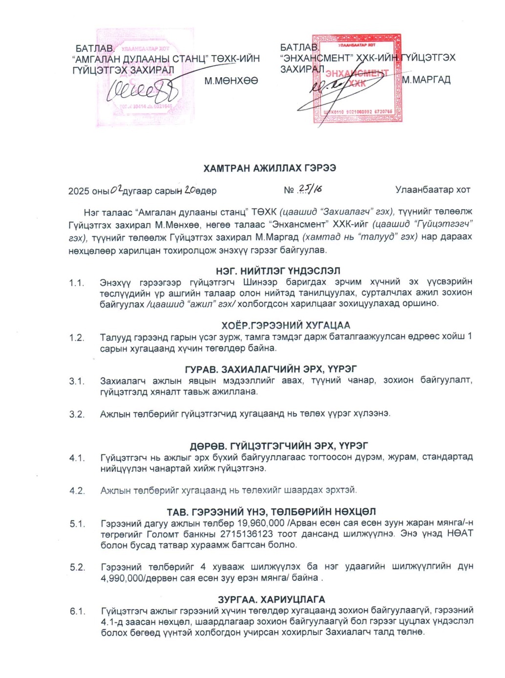 Тус компанийн захирал М.Мөнхөө гэгч нь 2024 оны 10-р сарын 23 болон 2025 оны 2-р сарын 20-ны өдөр Майн Римек ХХК, Блейк стар альфа ХХК, Визлис визард ХХК, Энхансмент ХХК, Огмент ХХК зэрэг компаниудтай нийт 8 удаагийн гэрээ байгуулж нийт 159.6 сая төгрөгийг төсвөөс санхүүжүүлэн шилжүүлжээ.