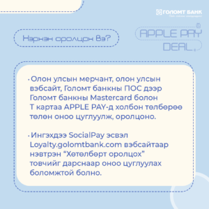 Голомт банк дэлхийн 90 орчим оронд хэрэглэгддэг хамгийн хялбар, найдвартай төлбөрийн хэрэгсэл Apple Pay үйлчилгээг 2024 оны 12 сард Монгол Улсад анхлан нэвтрүүлсэн. Тэгвэл энэхүү үйлчилгээг ашигладаг үнэнч харилцагч нартаа зориулсан “Apple Pay Deal” урамшууллыг 2025.06.30-ныг дуустал зарлаж байна.
