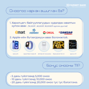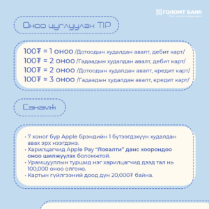 Голомт банкны харилцагч та олон улсын худалдааны вэбсайт, олон улсын мерчант болон Голомт банкны ПОС дээр Apple Pay-ээр төлбөрөө төлөн оноо цуглуулж, оноогоороо хамтрагч байгууллагуудын хөнгөлөлт урамшуулалд хамрагдах болон Apple брэндийн нэрийн бүтээгдэхүүнийг авах боломжтой.