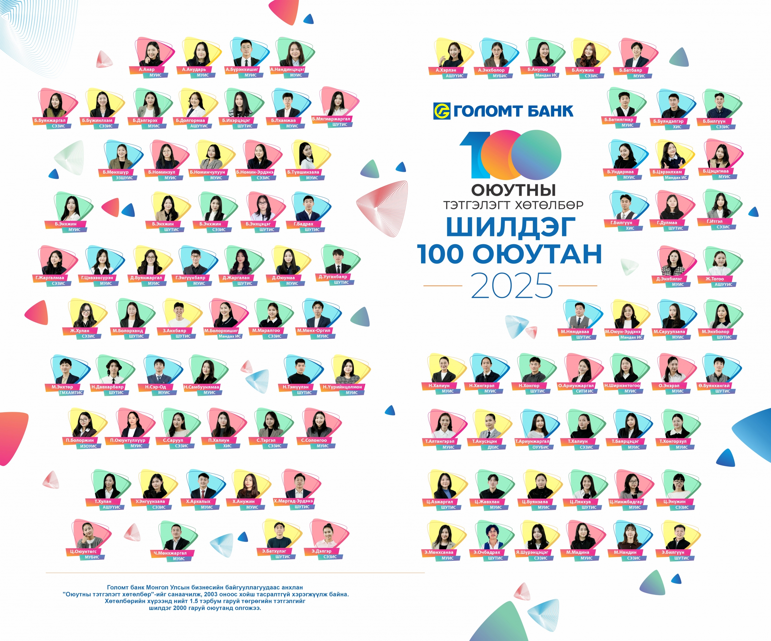 Голомт банкны нэрэмжит “Оюутны тэтгэлэгт хөтөлбөр”-ийн 2025 оны шилдэг 100 оюутныг шалгаруулж, сургалтын тэтгэлэг гардууллаа. Энэ удаагийн тэтгэлэгт хөтөлбөрт Монгол Улсын магадлан итгэмжлэгдсэн их, дээд сургуулиудын 3, 4-р дамжааны мэргэжлийн чиглэл харгалзахгүй 1000 гаруй оюутан материалаа ирүүлснээс шилдэг оюутнуудаа тодруулсан юм.