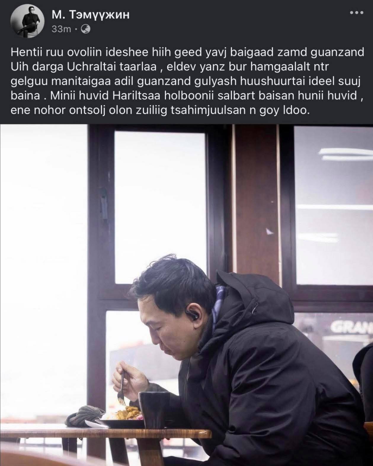 Энэ талаар М. Тэмүүжин нэртэй цахим хэрэглэгч "Хэнтий рүү өвлийн идэшээ хийх гээд явж байгаад замд гуанзанд УИХ-ын дарга Н.Учралтай таарлаа, элдэв янз бүр хамгаалалт энэ тэр гэлгүй манитайгаа адил гуанзанд гуляш, хуушууртай идээл сууж байна. Миний хувьд харилцаа холбооны салбарт байсан хүний хувьд, энэ нөхөр онцгой олон зүйлийг цахимжуулсан нь гоё л доо" хэмээн энэхүү зургийг постолсон байна.